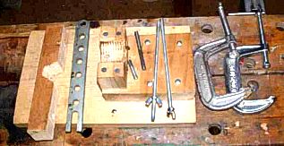 The last item to fabricate is a steel bar drilled to match the holes in the top piece. This is so when you tighten the wing nuts on the threaded rods compression force is transfered from the steel bar to the top wooden block. Otherwise the block will break in the middle from the forces applied to the side.
